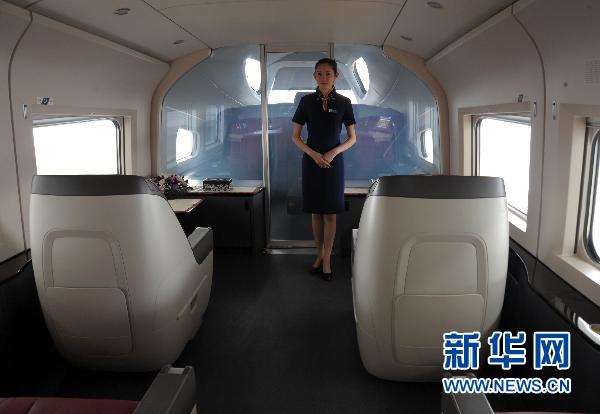 資料圖片:這是6月12日拍攝的參加試運(yùn)行的京滬高鐵VIP觀光車廂女乘務(wù)員。近日,京滬高鐵司乘人員開始投入全線試運(yùn)行。新華社發(fā)(鈕一新 攝)