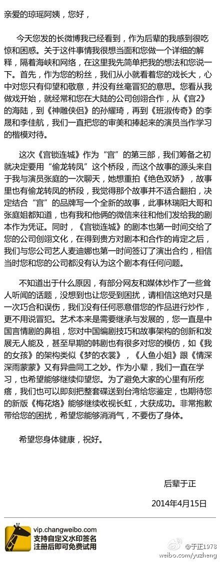 @于正1978 回應#瓊瑤舉報于正抄襲#,稱故事源頭來自“偷龍轉鳳”的橋段,這個橋段在很多劇作中出現過。于正表示,請相信這絕對只是一次巧合和誤傷,我們沒有任何惡意借您的作品進行炒作,更不用說冒犯.