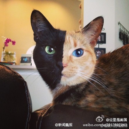 Venus是一只罕見的“嵌合體貓”,基因造成她的臉一邊黑色一邊棕黃色,眼睛也是一藍一綠。Venus曾是只流浪貓,4年前被主人收養。主人說她雖然吃得多,卻是個十足的軟妹子。這真的不是二貨主人用墨水染的嗎?