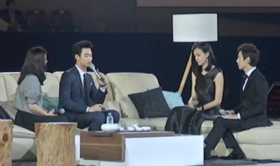 在北京的記面會上,繼韓星全智賢出場后,金秀賢身穿西裝登場,他用中文說:“大家好,我是金秀賢。”他表示自己都想好似都敏俊一樣有超能力,可以經歷很長的歲月,他又表示想吃北京地道的小籠包。