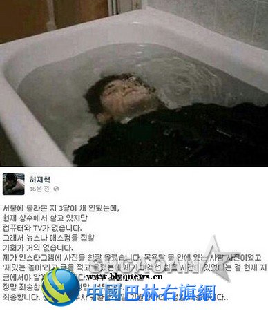 韓國16 日上午發生“歲月號”客輪沈船意外,目前尚有288人失蹤,這起嚴重船難以引起社會關注。但卻有一名小咖男模許載赫17日在個人社群網站上上傳一張自拍 照,照片中他整個人浸泡在注滿水的浴缸里,雙眼緊閉像是浮在水面的浮尸,讓人不禁聯想到沉船意外,被網友群起炮轟“沒水準”,一點都沒有同情心。