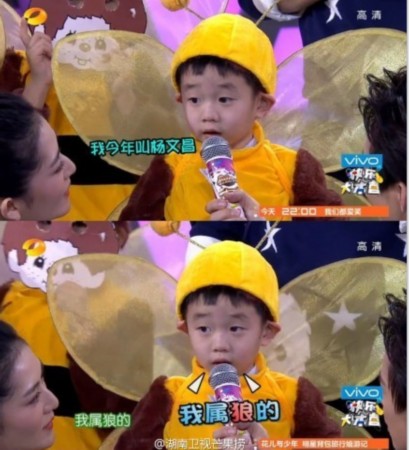 湖南衛視芒果撈:我爸爸姓楊,我媽媽姓楊,我也姓楊,#我今年叫楊文昌# ,我明年可能叫楊冪。楊威兒子在參加《快樂大本營》時,當主持人要求小家伙做自我介紹時,小家伙毫不怯場奶聲奶氣的說到:“我今年叫楊文昌,我屬狼。