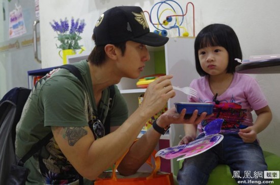 吳尊給女兒喂飯。