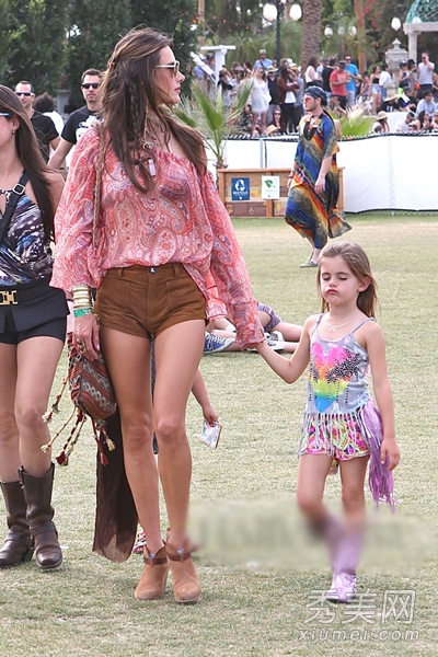 示范搭配:紅色印花露肩雪紡衫+黃色短褲+黃色短靴+黃色流蘇包,帶著女兒參加音樂節(jié)的亞歷山大安布羅休穿的熱辣又很有民族風情,長腿好身材一點也看不出是旁邊小女孩的媽媽。