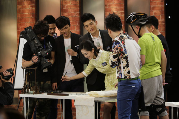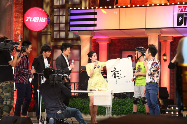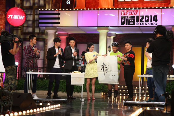 當天,吳奇隆攜孫藝洲、蔣勁夫、葉祖新做客《嗨!2014》,他們與快樂大使謝娜、哈林進行了一場書法比拼。節目組特意請來中華書畫神童出任裁判,兩隊完成兩輪漢字拼寫后,由裁判判定輸贏結果。起初,謝娜并未展現自己的書法實力,一直到整個比拼宣告結束后,她終于忍不住提筆,寫下一個“龍”字,字體龍飛鳳舞,筆觸舒勁有力。她說:“龍字獻給你們,希望你們能飛龍在天!”一番話引得觀眾掌聲不斷,更是有人當場奉其為“才女”。