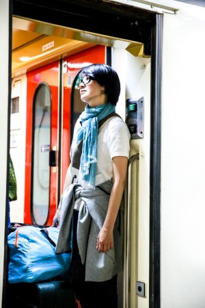 登上火車站在列車廂門口的晴姐今天有點小疲憊了