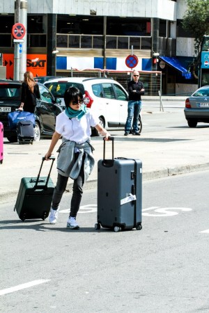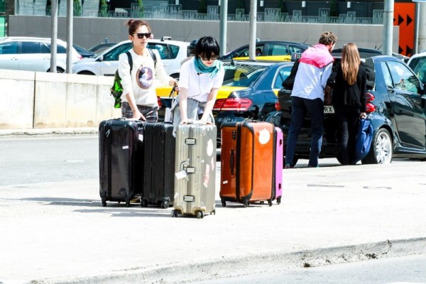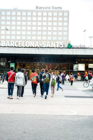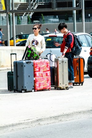 巴塞羅那火車站門口許晴跟花花看行李