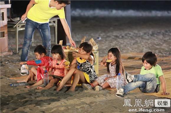 萌娃吃燒烤 《爸爸去哪兒》本周臺灣之旅步入尾聲,五組家庭和林志穎父子歡聚海邊BBQ,邊燒烤邊進行露天KTV好不熱鬧。