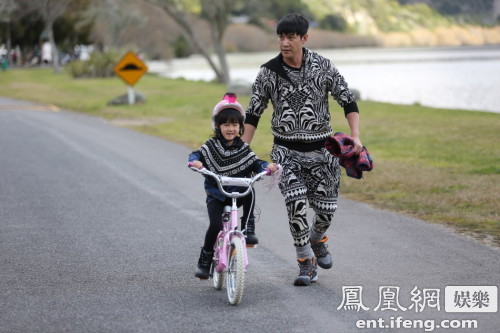 此次新西蘭之旅,陸毅和貝兒在新西蘭毛利傳統家庭中做客。當時幾個大孩子在一旁玩山地車,貝兒看到覺得十分好玩,也想體驗一把。剛開始老爸陸毅并不同意,因為之前貝兒接觸過的自行車后面都有兩個小輪子保持平衡,不會跌倒,但這邊可是貨真價實的山地車。但看著當時其他孩子要么騎車要么劃船,貝兒一個人在那兒有點兒孤零零的,就心軟了:“貝兒,爸爸教你騎車吧。”陸毅開始扶著自行車教貝兒騎車要領,一點點保持平衡,誰料五分鐘之后,從一條直路往返時,陸毅已經可以撒手不扶了:“我那天中午真的很為貝兒驕傲,真的五分鐘就會了,我在背后看她越騎越好,越騎越遠,我真的好為她高興”,不過陸毅還順帶夸贊自己在《爸爸去哪兒》中始終保持的長腿家族優勢,“貝兒的運動天賦這么好,我想是遺傳吧。”