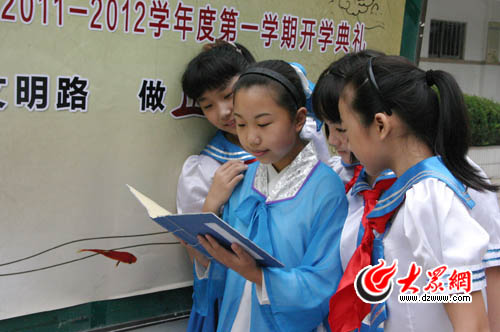[提要] “學(xué)做人,講文明,禮儀之邦人知曉。樹(shù)校風(fēng),強(qiáng)校紀(jì),正德文明記心里。”開(kāi)學(xué)第一天,濟(jì)南市青龍街小學(xué)組織了以“走至善文明路 做正德青小人”為主題的開(kāi)學(xué)典禮。小學(xué)生們穿上古裝,朗讀起修生養(yǎng)性的《正德歌》。