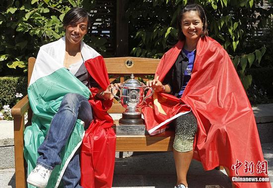 當(dāng)?shù)貢r間6月3日,法網(wǎng)決賽前夕,中國選手李娜同意大利選手斯齊亞沃尼各披本國國旗,手握法網(wǎng)獎杯現(xiàn)身巴黎接受各國記者的采訪。