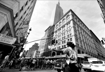 24日,一名警察在美國紐約帝國大廈附近指揮交通。新華社發(fā)