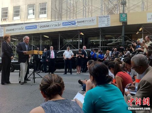 當地時間24日,紐約帝國大廈發生槍擊案,造成十多人死傷。圖為紐約市長布隆伯格在帝國大廈附近召開緊急記者會介紹槍擊案進展。紐約警察局長凱利、紐約市議長柯魁英(Christine Quinn)等一同出席。李洋攝