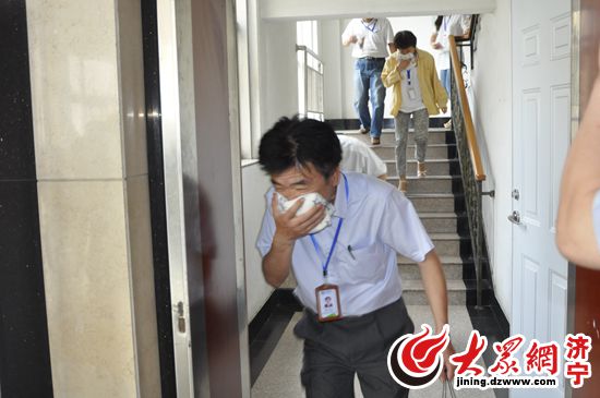 正在辦公的濟(jì)寧移動員工們,立刻用毛巾捂住口鼻,弓腰快速向安全出口跑去,沿著樓梯,向安全場地逃離疏散。另有幾名員工拿起消防水槍,對準(zhǔn)模擬的著火點(diǎn),實(shí)施快速滅火。幾分鐘時間,辦公大樓內(nèi)150多名員工成功逃生。
