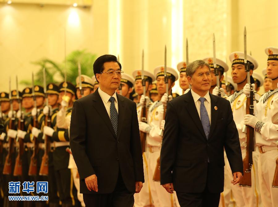 6月5日,中國國家主席胡錦濤在北京人民大會堂主持儀式,歡迎來華出席上海合作組織成員國元首理事會第十二次會議,并對中國進行訪問的吉爾吉斯斯坦總統阿坦巴耶夫。新華社記者姚大偉攝