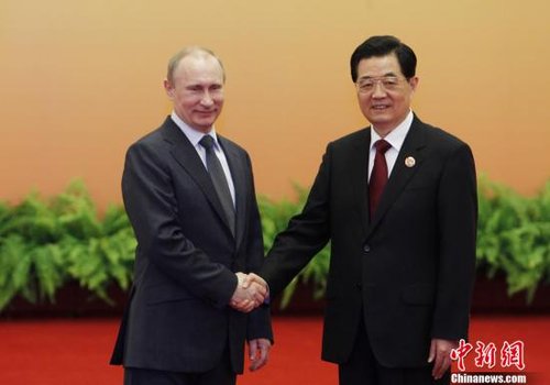 6月7日,上海合作組織成員國(guó)元首理事會(huì)第十二次會(huì)議舉行大范圍會(huì)談等活動(dòng)。中國(guó)國(guó)家主席胡錦濤在北京人民大會(huì)堂北大廳握手迎接與會(huì)各國(guó)領(lǐng)導(dǎo)人及國(guó)際組織代表,隨后進(jìn)行集體合影。圖為胡錦濤主席與俄羅斯總統(tǒng)普京握手。中新社發(fā) 杜洋 攝