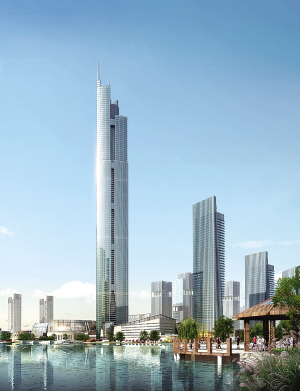 記者了解到,北湖東南角的400米超高層地標建筑為一棟商務辦公樓宇,該建筑主體呈圓柱形,層高為99層,在其東西兩側分別建有6層的花瓣狀辦公裙房,從而讓整個建筑的外部視覺效果更佳豐滿和立體。該超高層地表北側就是陽光大草坪以及休閑之島和水上餐廳,再往北則是開挖的北湖水域,在其南側則規劃了大片的高層住宅,層高均超過20層。