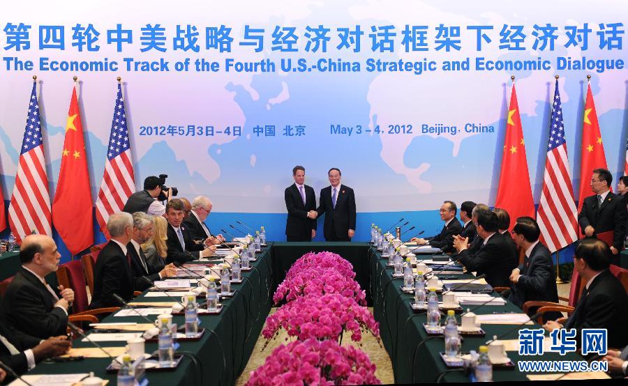 5月3日,第四輪中美戰(zhàn)略與經(jīng)濟(jì)對(duì)話框架下經(jīng)濟(jì)對(duì)話在北京釣魚臺(tái)開幕。中國國務(wù)院副總理王岐山和美國財(cái)政部長蓋特納共同主持對(duì)話。 新華社記者謝環(huán)馳 攝