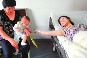 7月3日,躺在病床上的吳菊萍用右手握著7個月大兒子陳至軒的小手。新華社發(fā)
