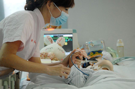 圖為7月11日,護士在重癥監護室擺放好妞妞的右手。妞妞的手腳已經有了不自主的運動。