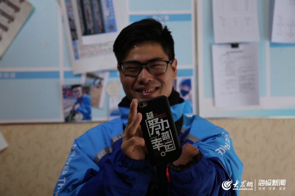 董洪喜的手機殼上寫了這樣一句話“越努力,越幸運”,他說是他的人生格言,所以,他努力工作,努力生活,也感覺自己很幸運。
